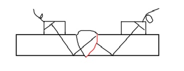 圖 1 對接焊焊縫余高未磨平、只能單面探測。可使用斜探頭、觀察一次或二次回波在焊縫兩側(cè)進(jìn)行掃查探傷。