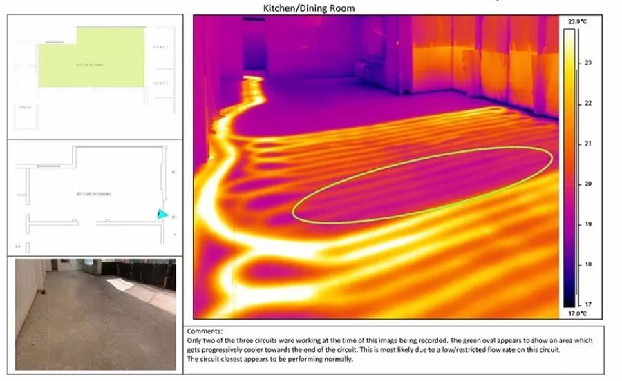 一個典型的實例是尋找地板加熱系統(tǒng)發(fā)生滲漏的位置。在紅外熱像儀的幫助下加熱系統(tǒng)的滲漏點可以被檢修人員發(fā)現(xiàn)并及時維修。精確確定滲漏點位置可以避免不必要的開挖過程,節(jié)省開支。