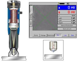TIV(通過壓痕觀察)法是建立在維氏硬度檢測之上的;此方法通過特殊的光學(xué)方法“看穿” 維氏金剛石。,當(dāng)探頭壓人在材料的同時(shí),壓痕的圖片就被直接、自動(dòng)并迅速地進(jìn)行傳輸和評估,超聲波測厚儀 硬度計(jì),儀器通過壓痕,讀出測量結(jié)果。